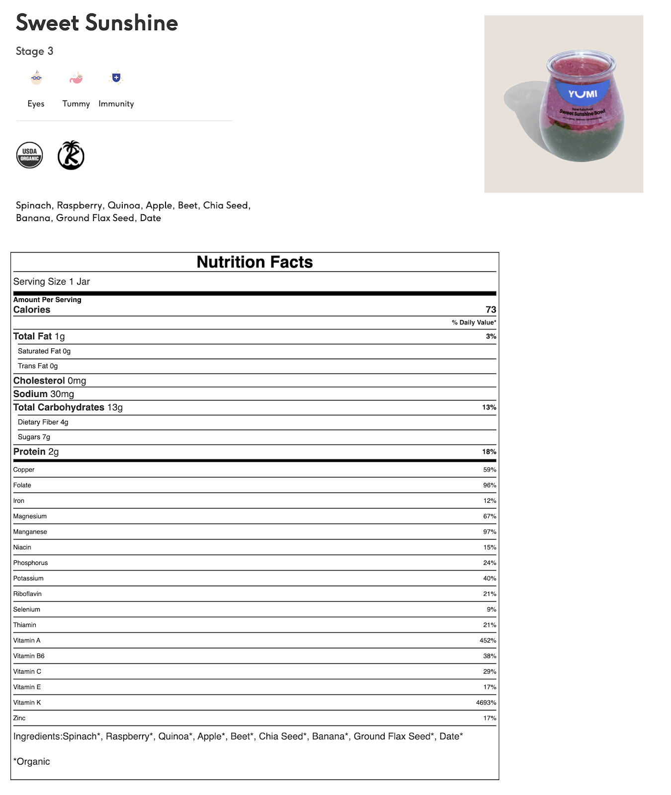 • Yumi is Organic, GMO free, Big 8 Allergen Free, and freshly made in California every week.